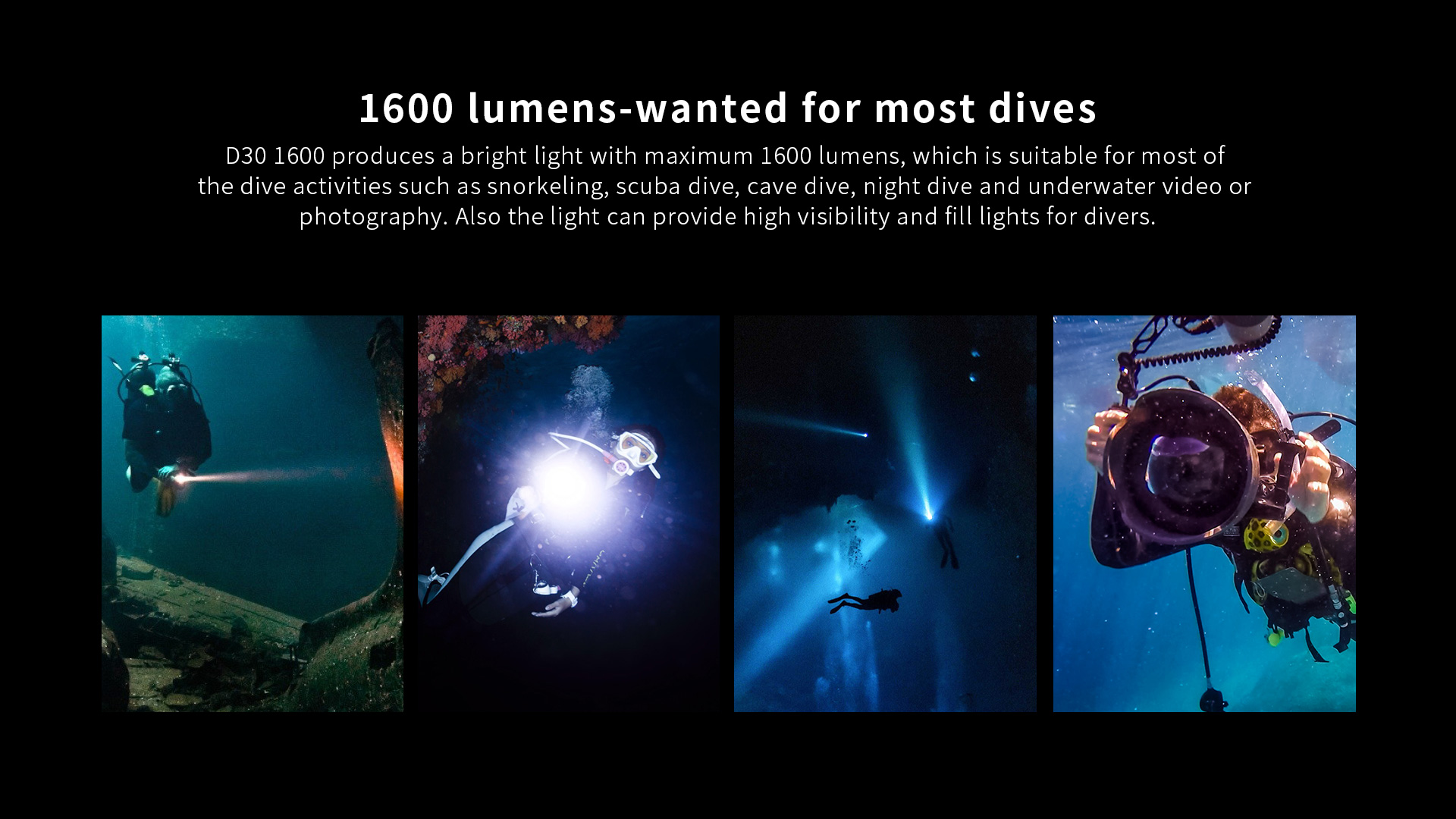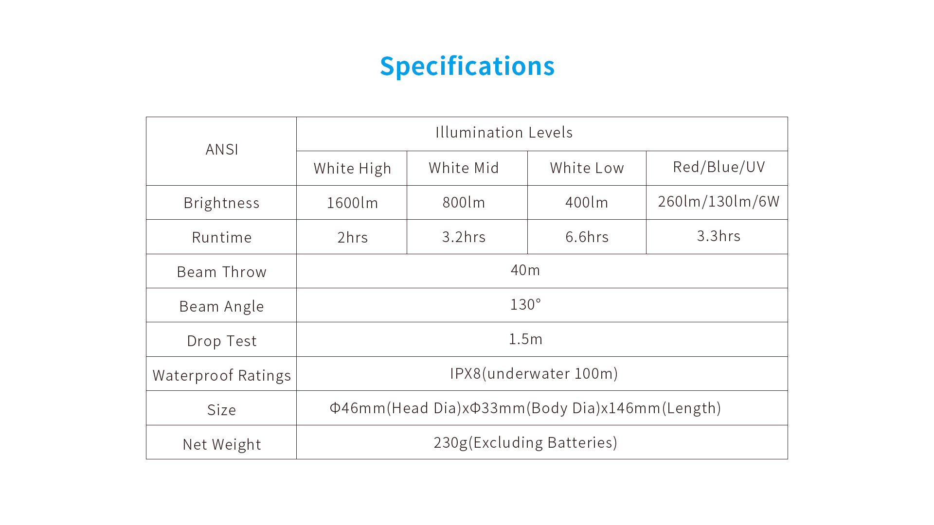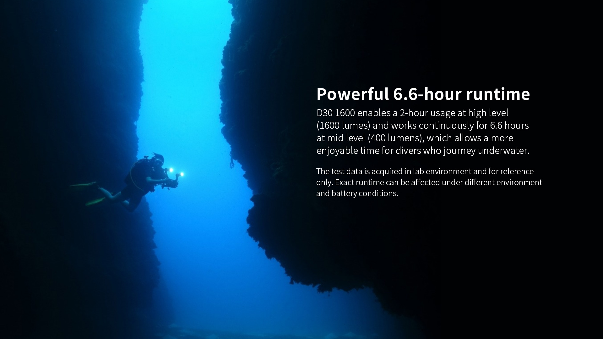 • Two hours runtime for 1600lm, 6.6 hours for 400lm.