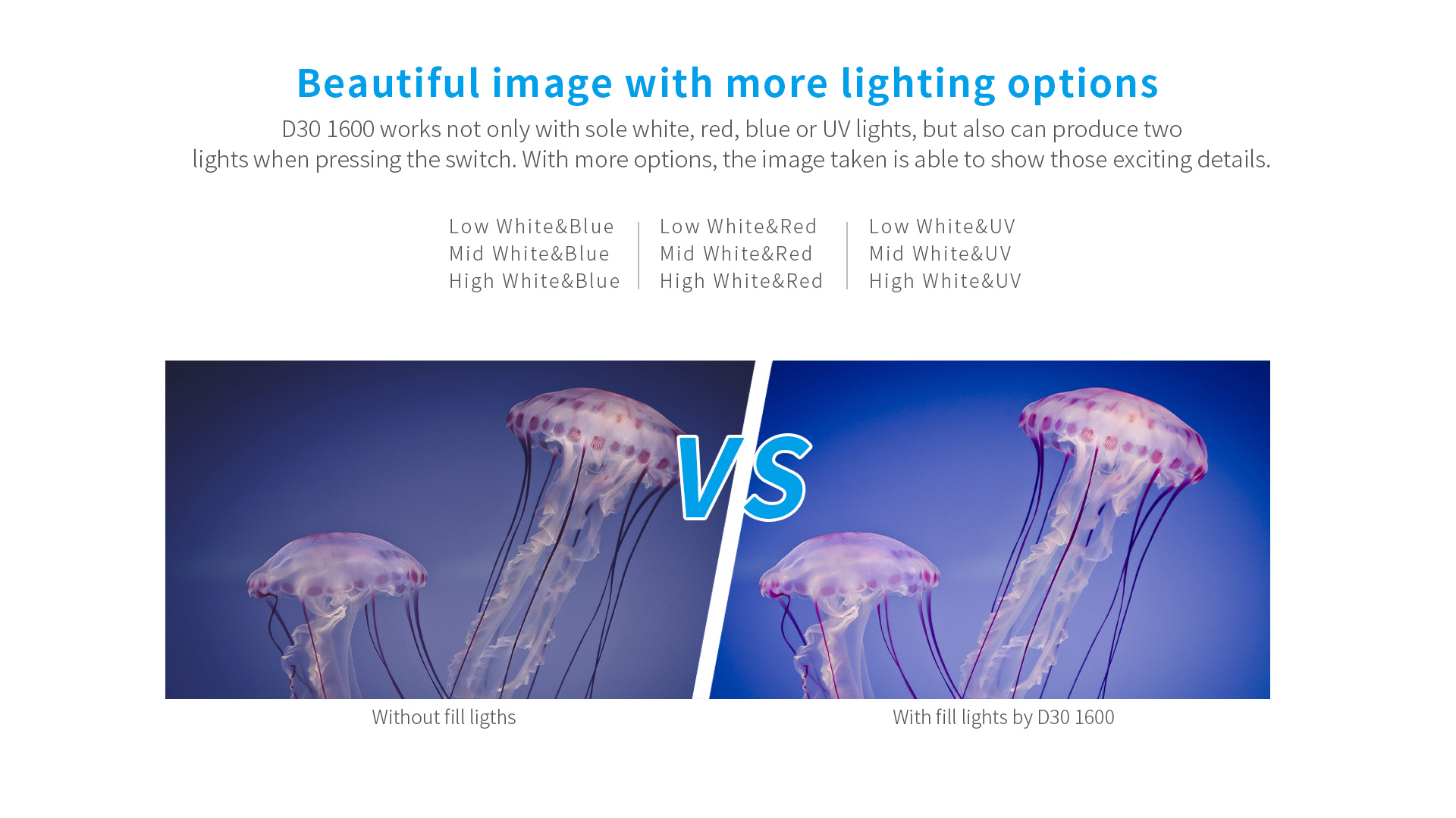 • Maximum 1600 lumens output, four light colors - white, red, blue and UV.