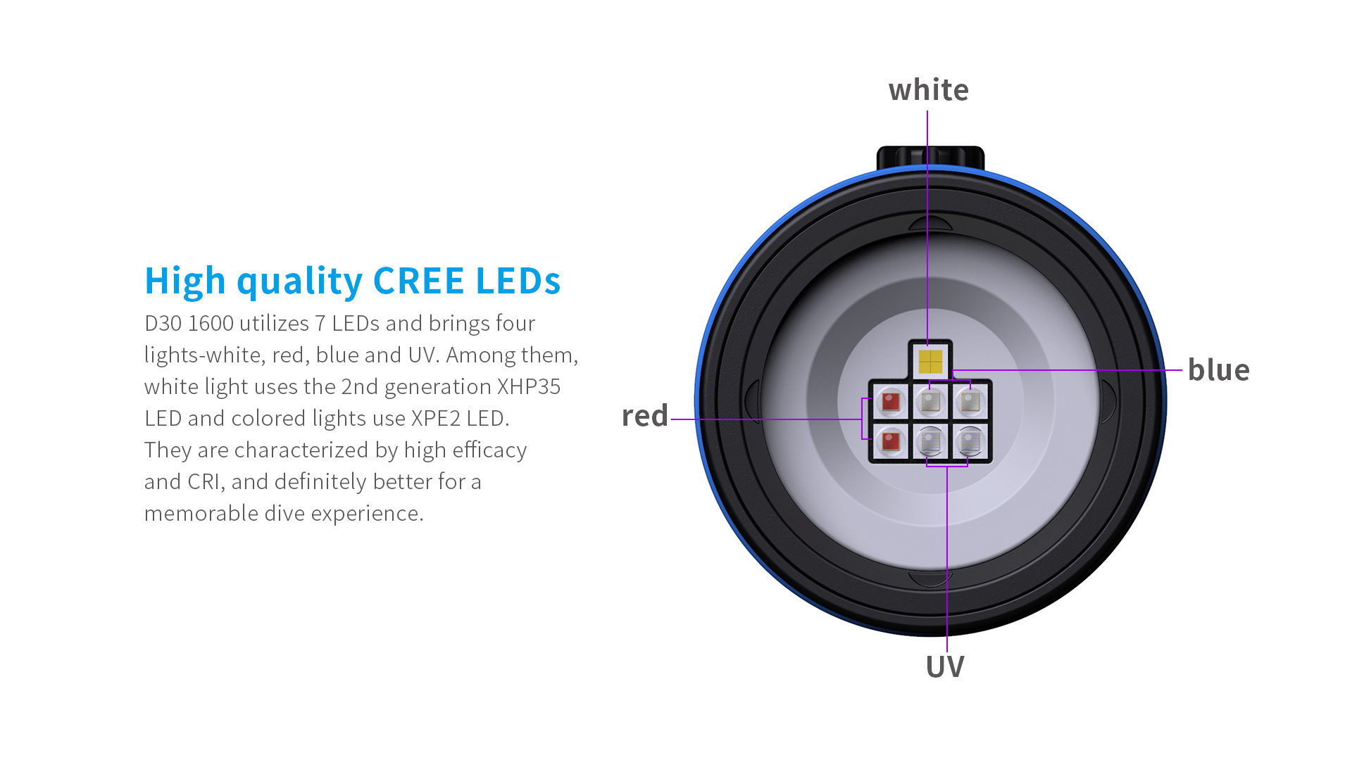 • High CRI, with 7 Cree LEDs - XHP35 for white light, XPE2 for colored lights.