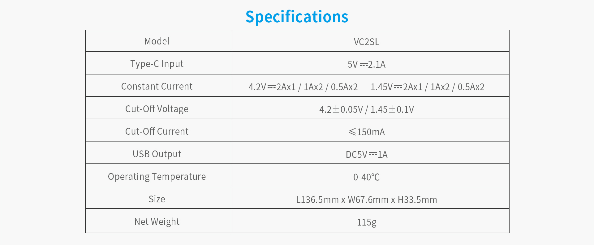 • Support charging current 1x2A, 2x1A, 2x0.5A