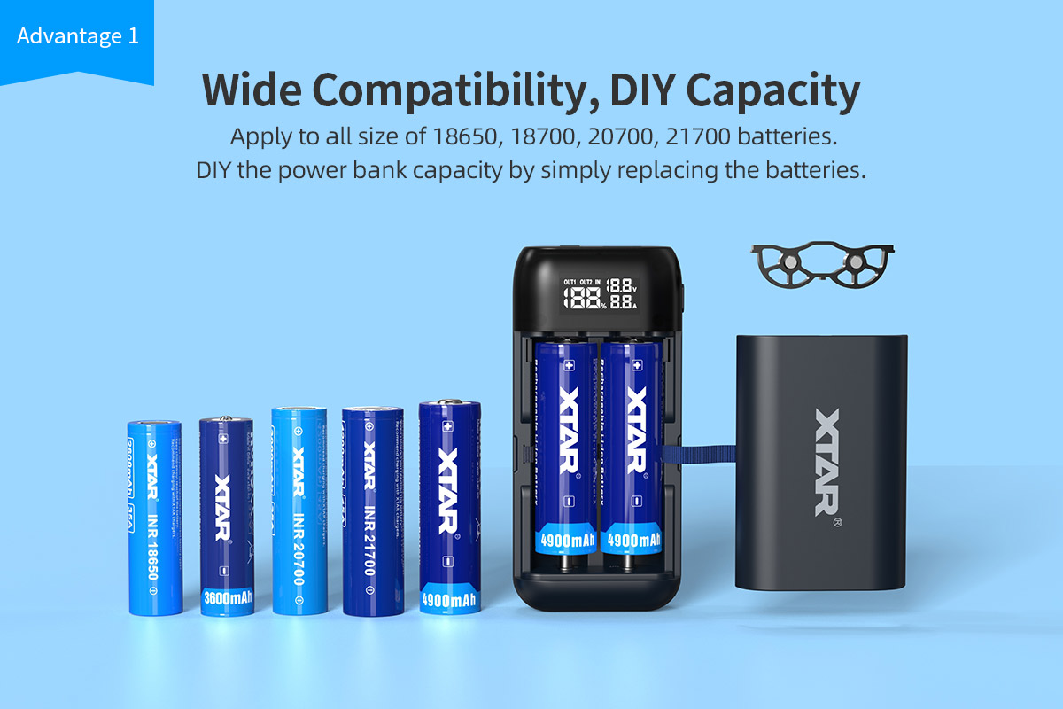 ● DIY the power bank capacity by simply replacing the batteries.