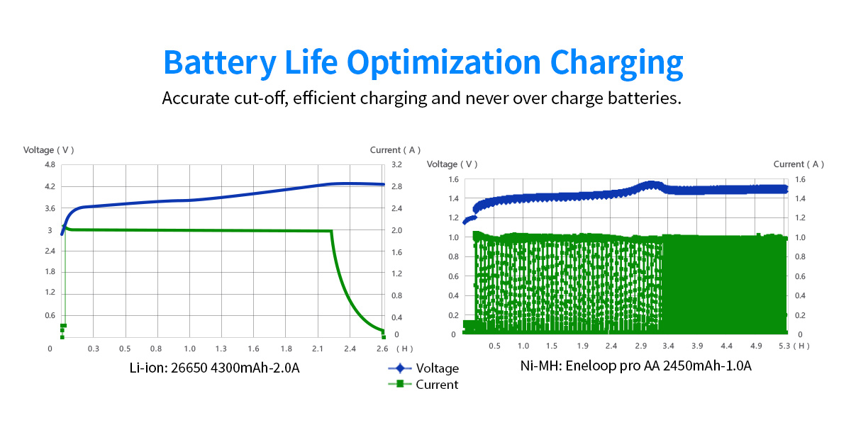 • Analyzer & tester for 3.6/3.7V Li-ion & NiMH batteries, much higher accuracy than other similar chargers.